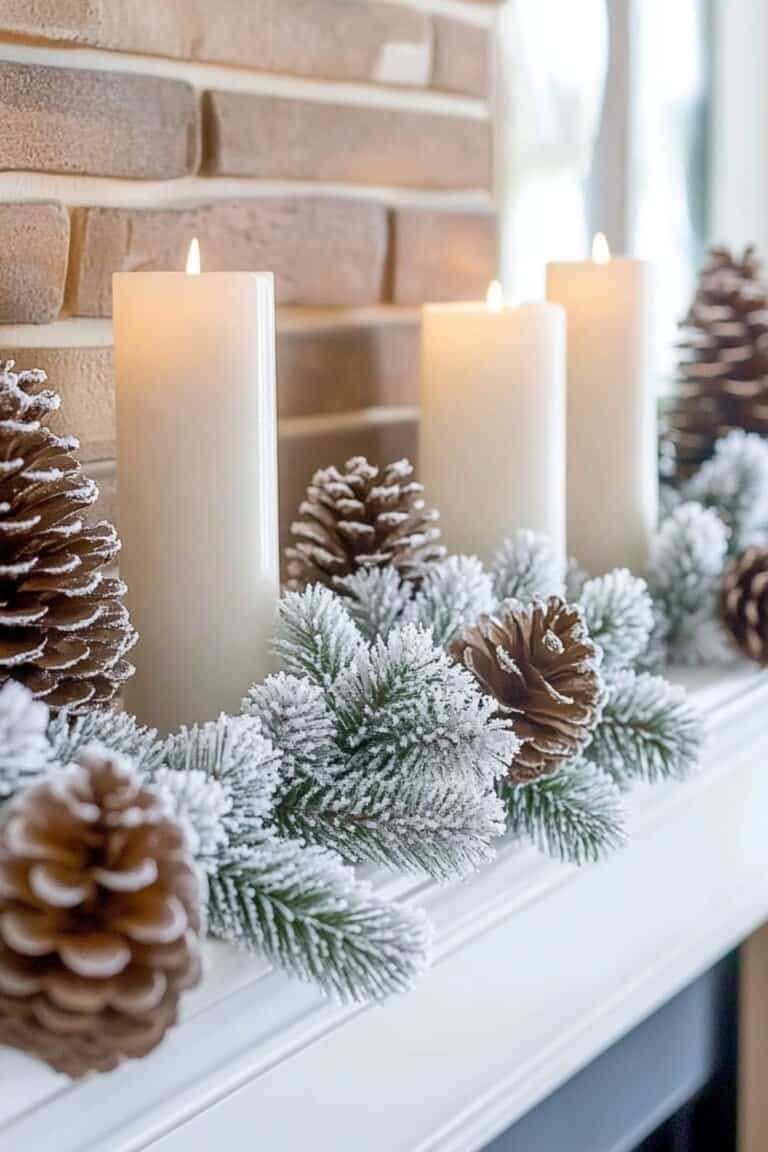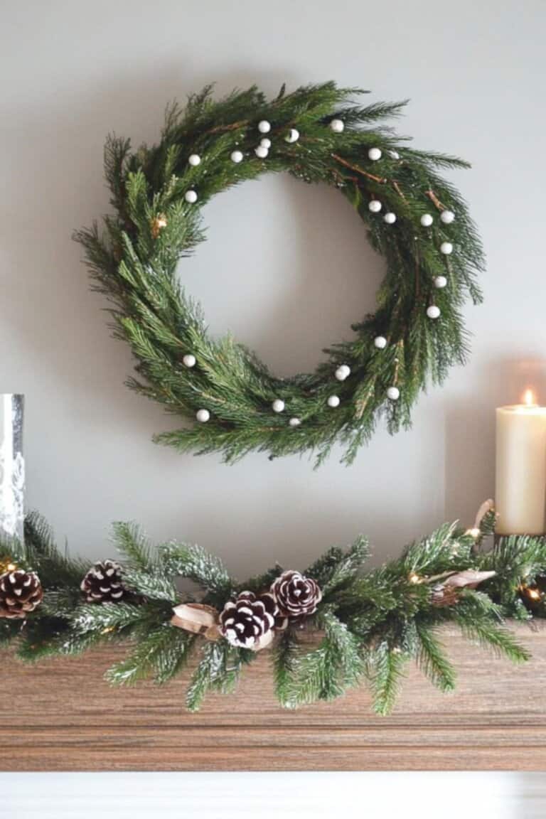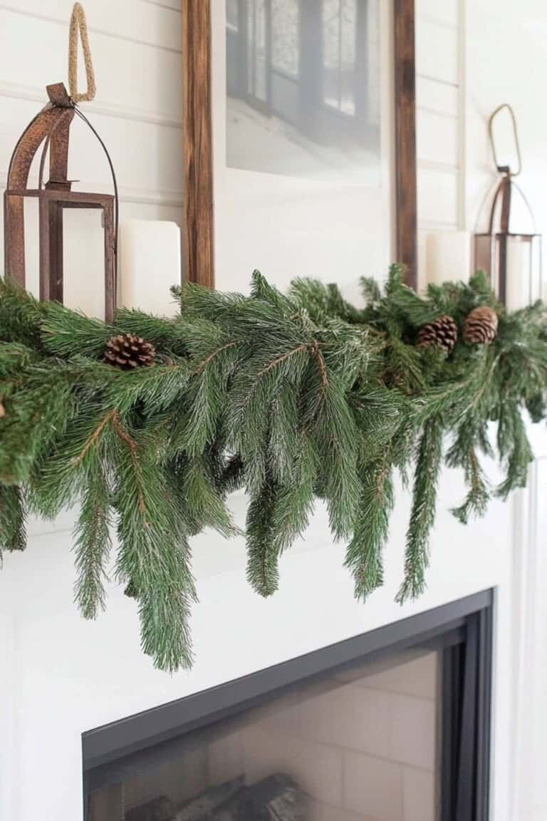 Pair a frosted pine garland with silver bulbs for an icy, elegant mantel setup.