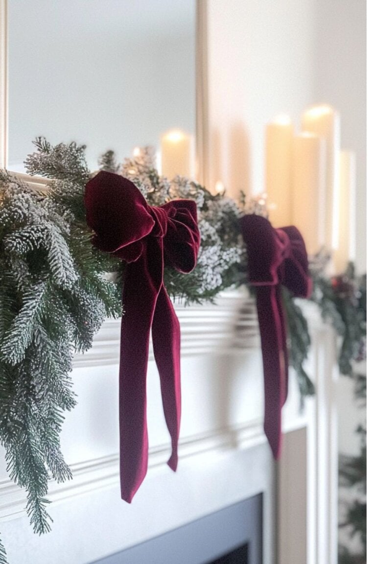 Use a soft pine garland as your base, then tie rich velvet bows in deep red, green, or navy along the length.