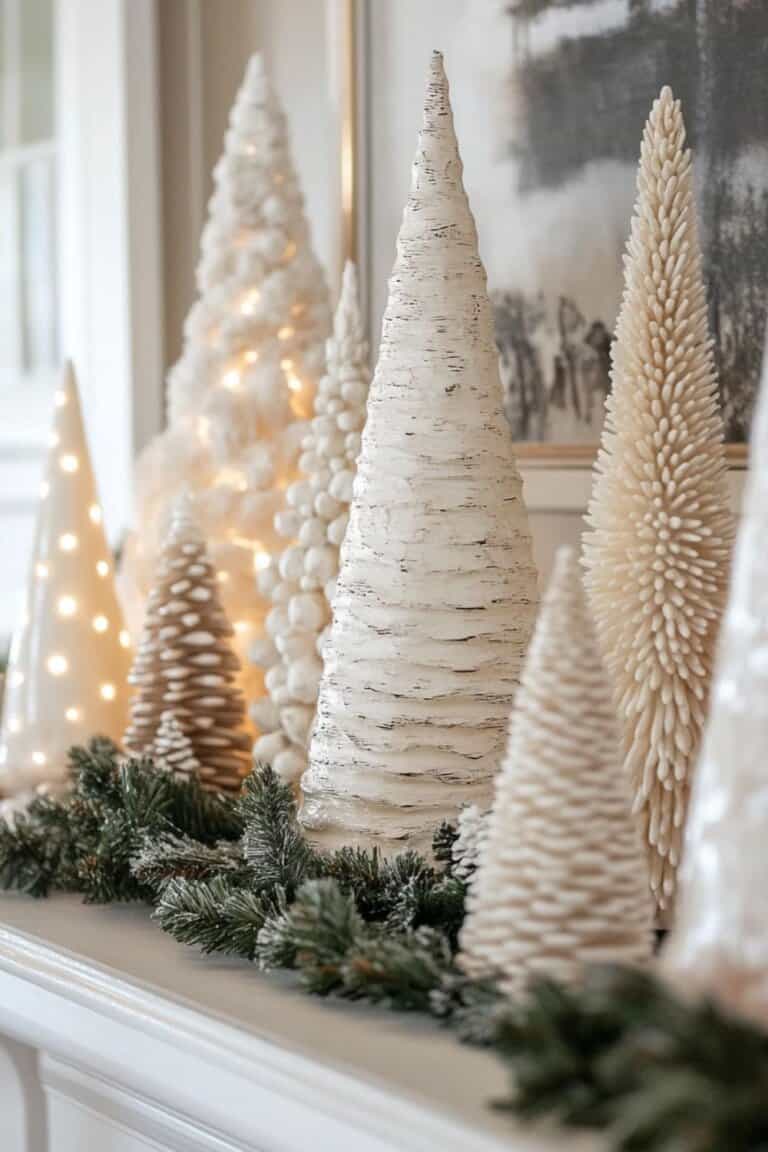 Cluster ivory-toned trees of different shapes and sizes across the mantel.
