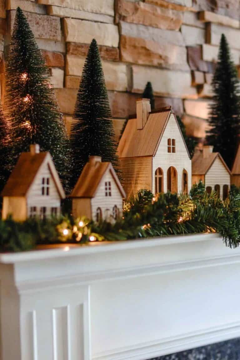 Line up a set of wooden or ceramic Christmas village houses along the mantel, spacing them out to leave room for little bottle brush trees or faux snow.