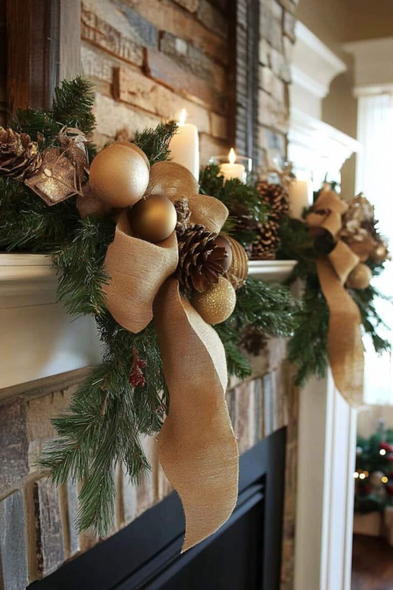 Wrap a classic pine or cedar garland with thick burlap ribbon and tie large bows at each end.