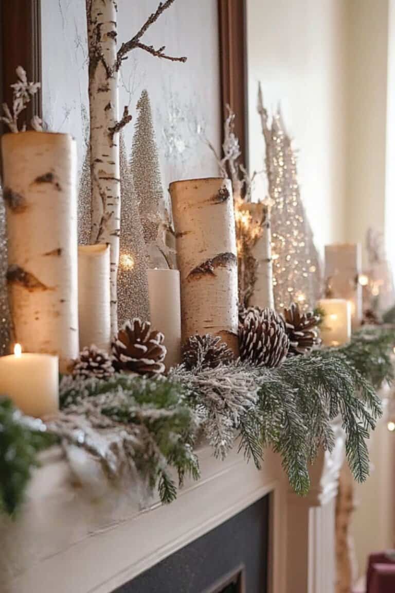I love how these birch brances add some vertical height to Christmas mantel decor.