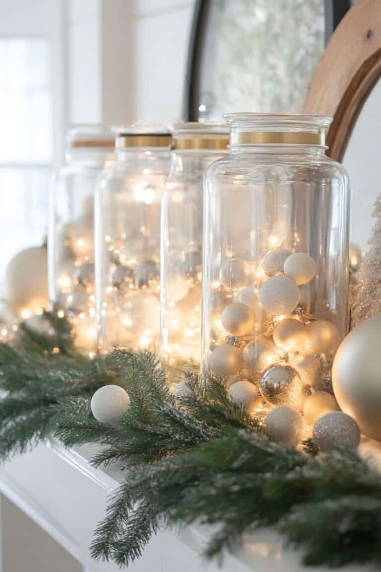 Fill clear glass jars or apothecary containers with classic ball ornaments and warm-toned fairy lights.