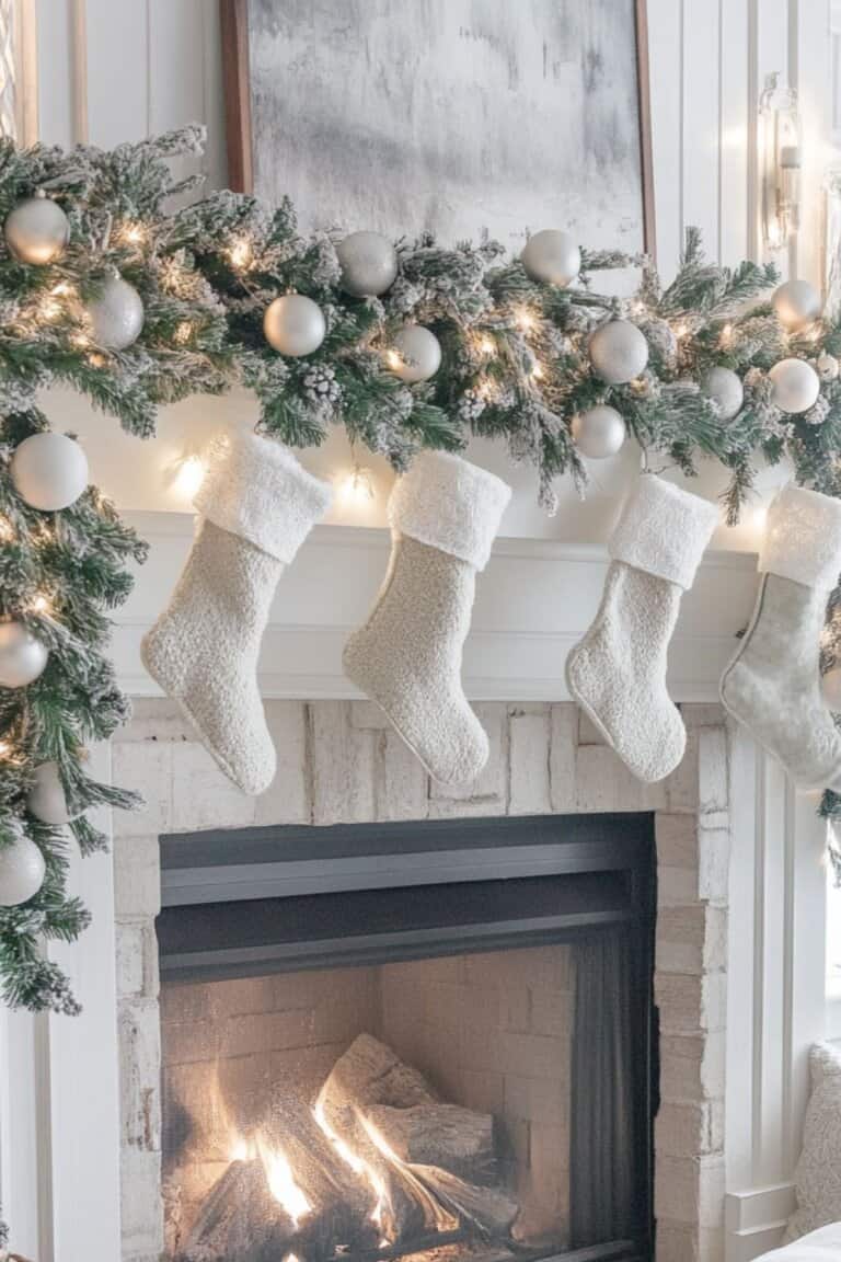 Hang cableknit stockings in soft neutral tones like ivory, gray, or blush for a cozy, winter-worn feel.