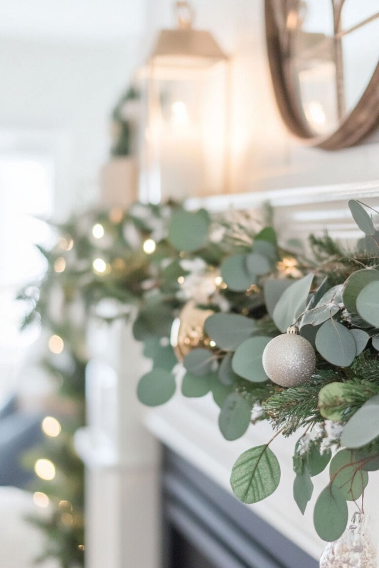 For a calm, minimalist look, drape a eucalyptus garland along the mantel and let the ends hang loose.