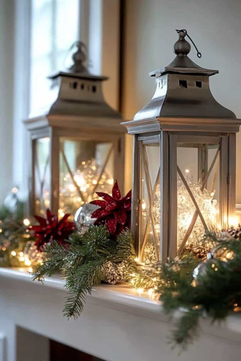 Place a few lanterns along the mantel and fill them with battery-operated fairy lights or small ornaments.