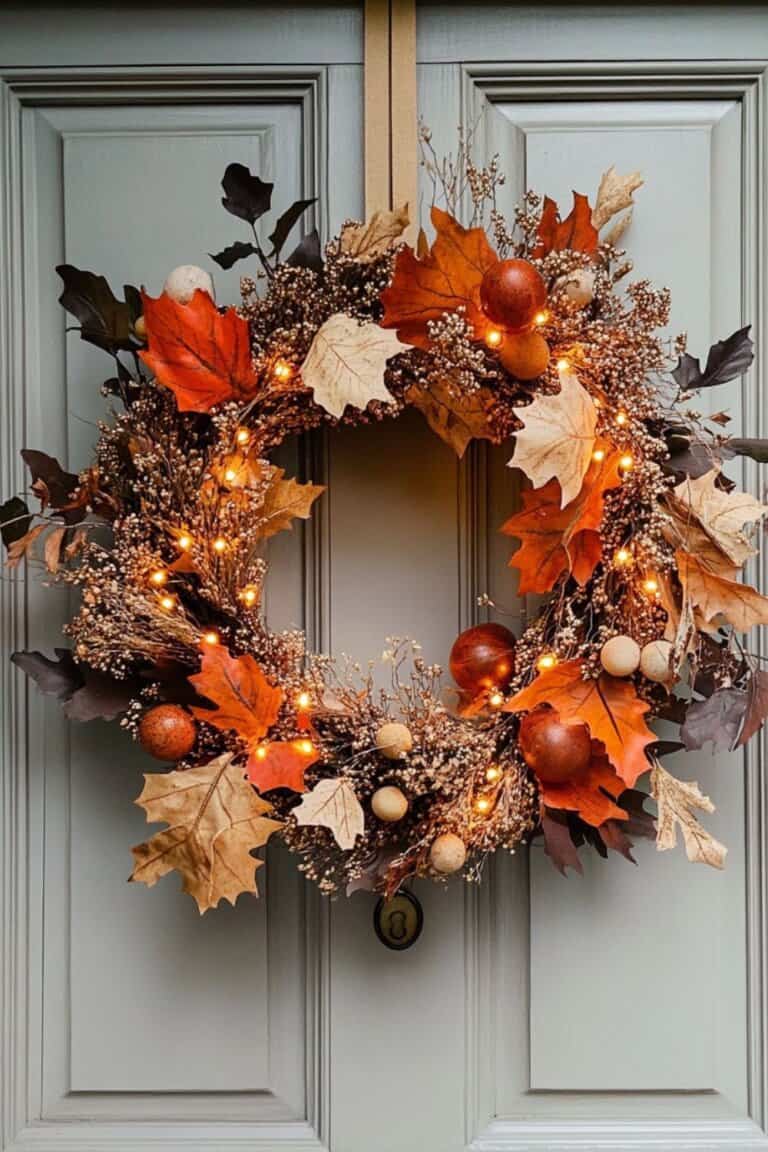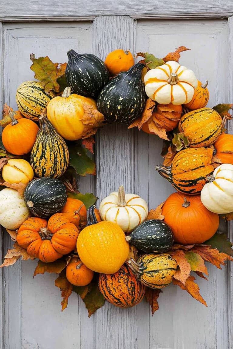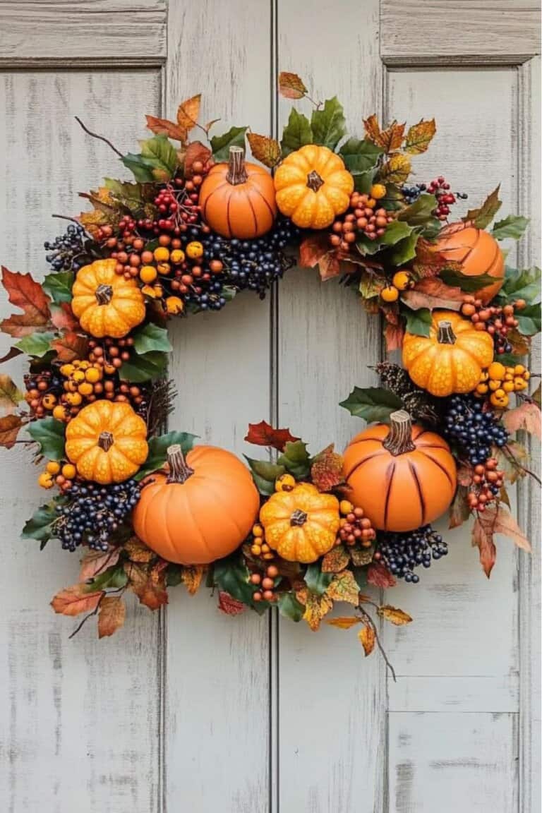 Faux gourds, mini pumpkins, and maybe a few berry sprigs make it feel like a full harvest is hanging on your door. It’s a little busy, but in a fun way.