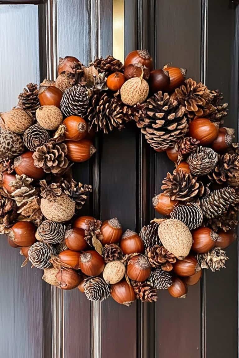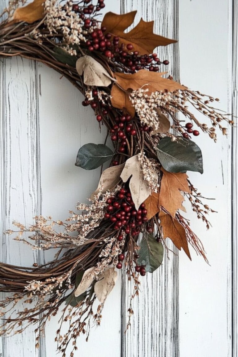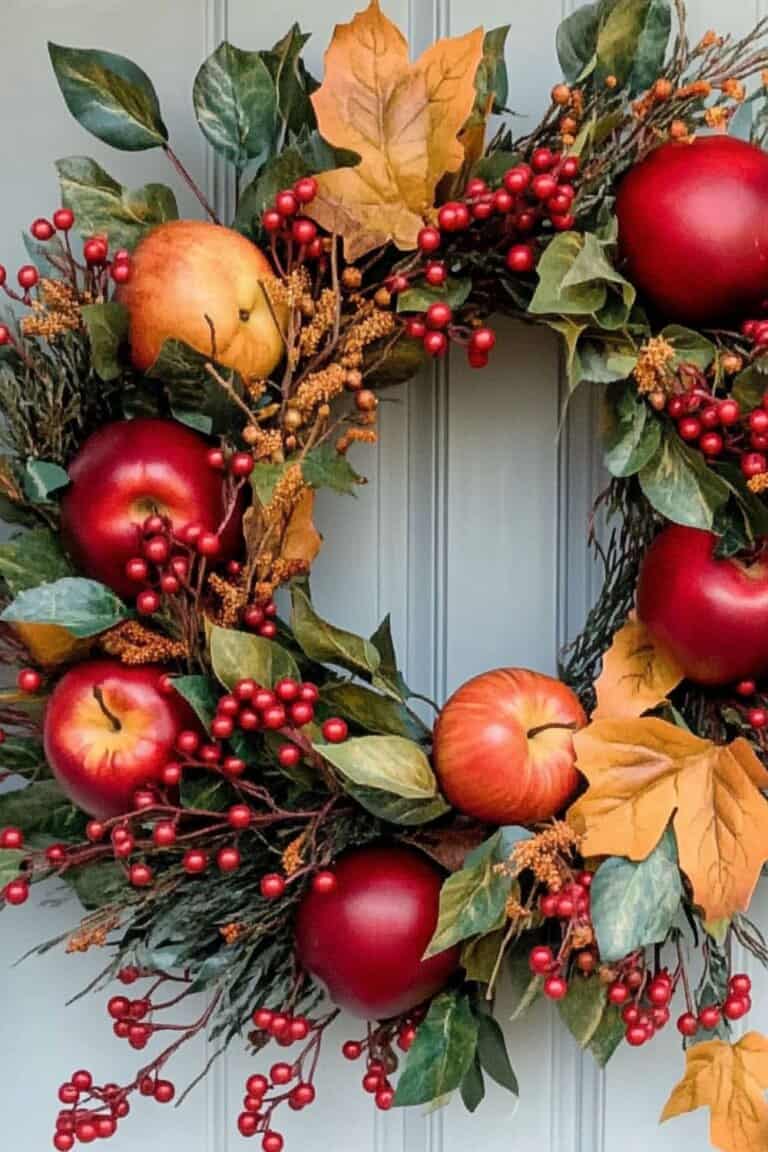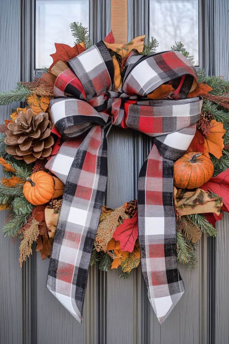 Faux gourds, mini pumpkins, and maybe a few berry sprigs make it feel like a full harvest is hanging on your door. It’s a little busy, but in a fun way.