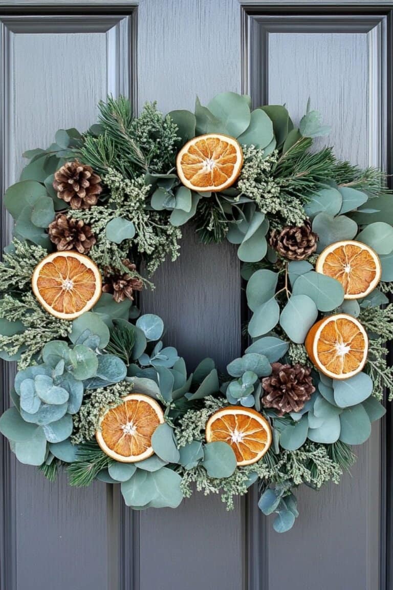 Eucalyptus branches make a cool, silvery base and the dried orange slices bring a soft, citrusy warmth.