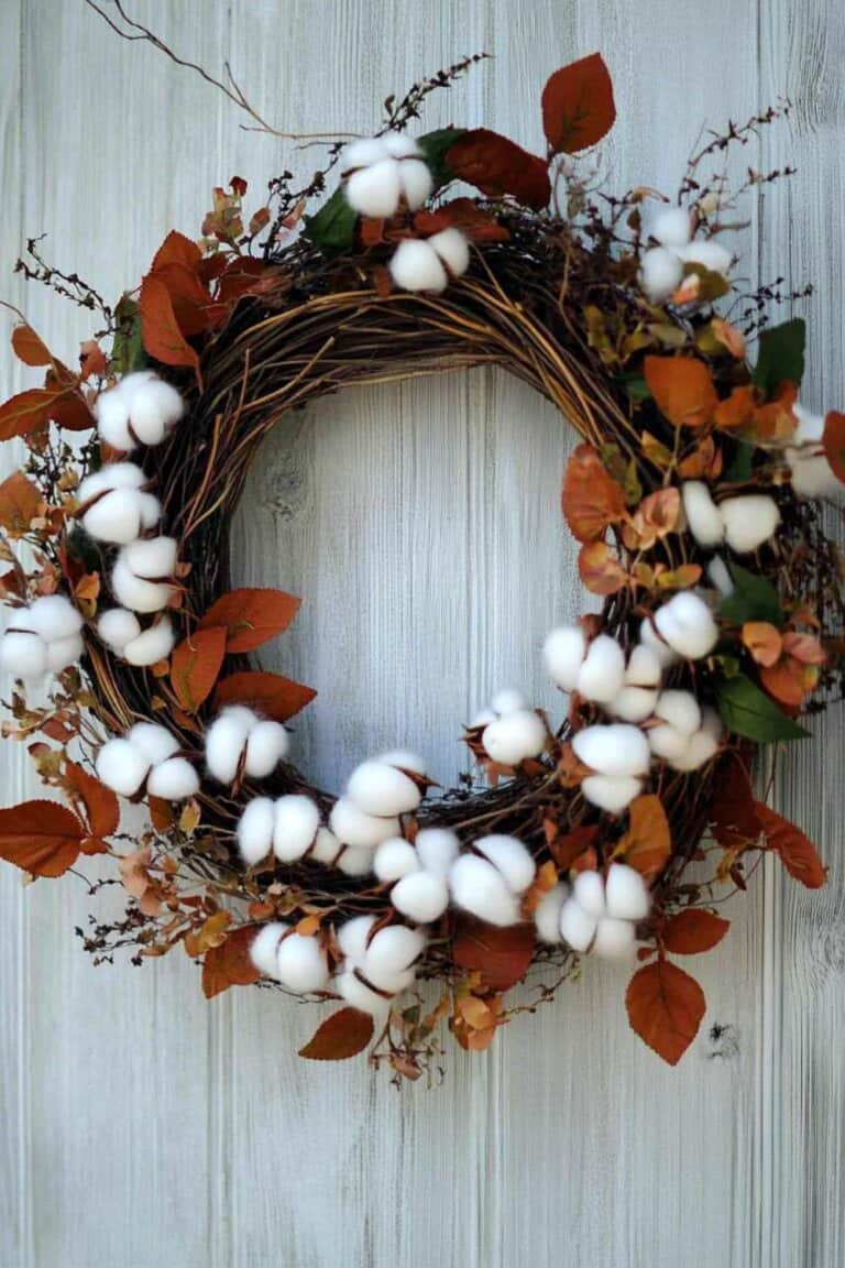 White cotton bolls pop against a darker wreath form and bring a soft, farmhouse-style texture to the front door.