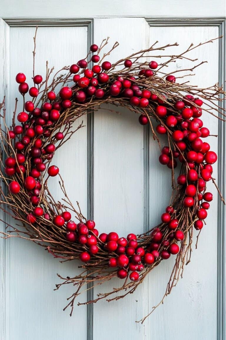 Thin twigs twisted into a wreath shape with faux cranberries tucked in give it a nice mix of rough and shiny.