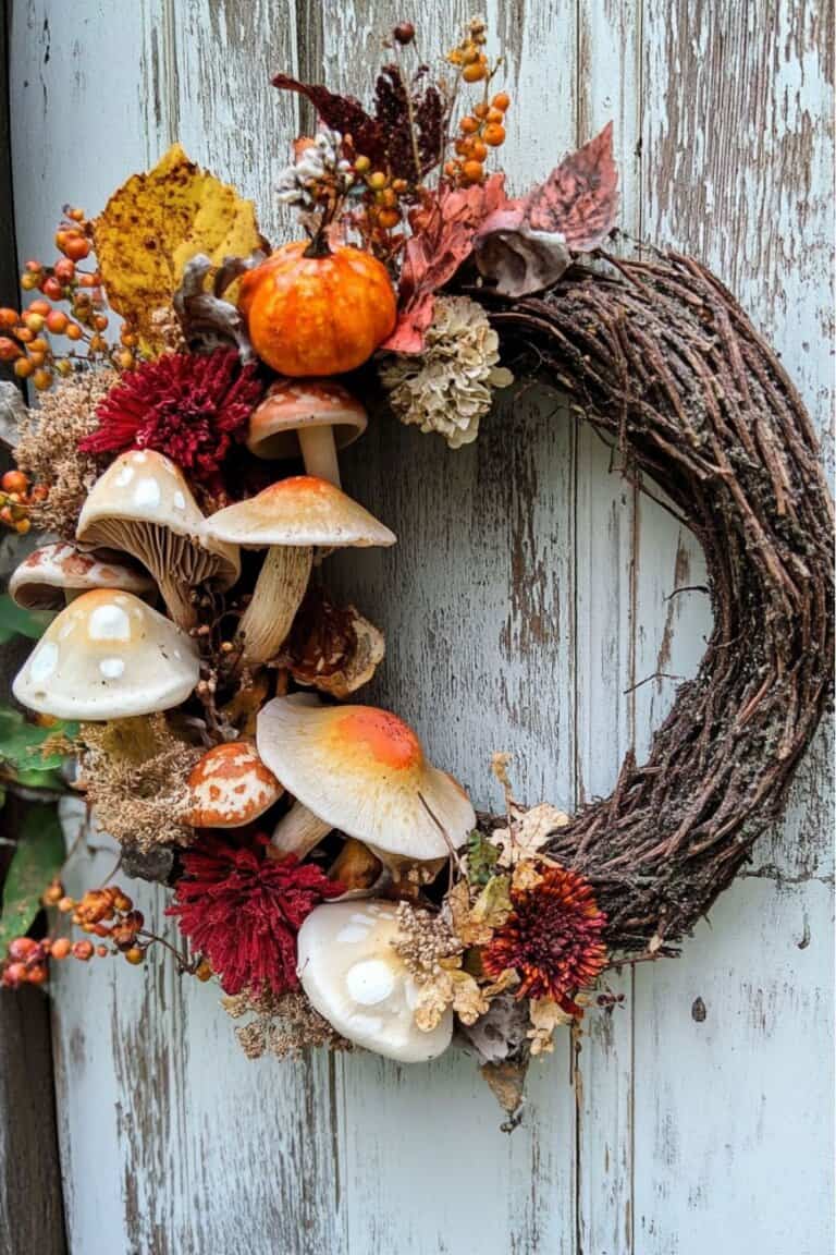 Tiny faux mushrooms tucked into moss or dried greenery gives this wreath a kind of enchanted forest vibe.