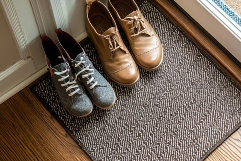 A mat with a tray keeps wet shoes in one spot instead of spreading puddles across the floor.