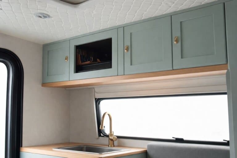 Overhead cabinets are useful, but they can make a camper feel heavy if they’re not used thoughtfully.
