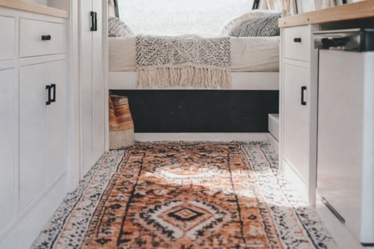 Thick rugs can bunch up, trip people, and visually shrink the floor space in a camper.