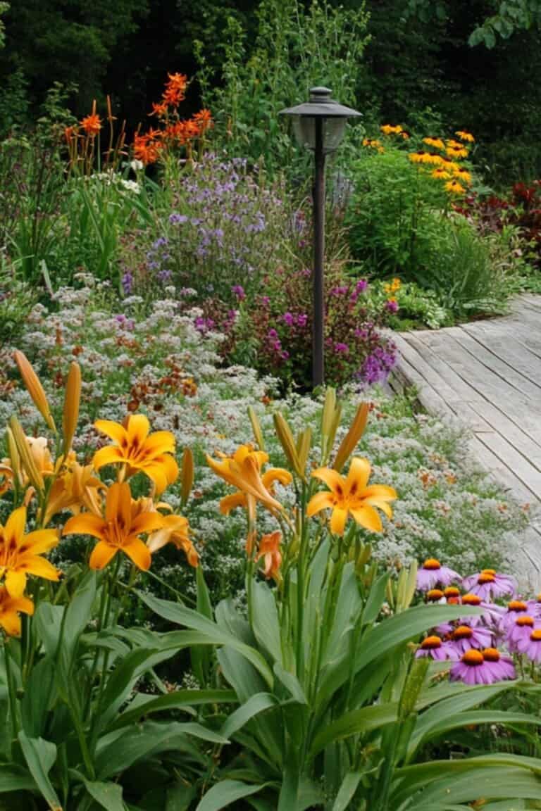 Just carve out a shallow border along one side of the deck, loosen the soil, and plant a few flowers that don’t need babysitting like daylilies, coneflowers, black-eyed Susans, and coreopsis.
