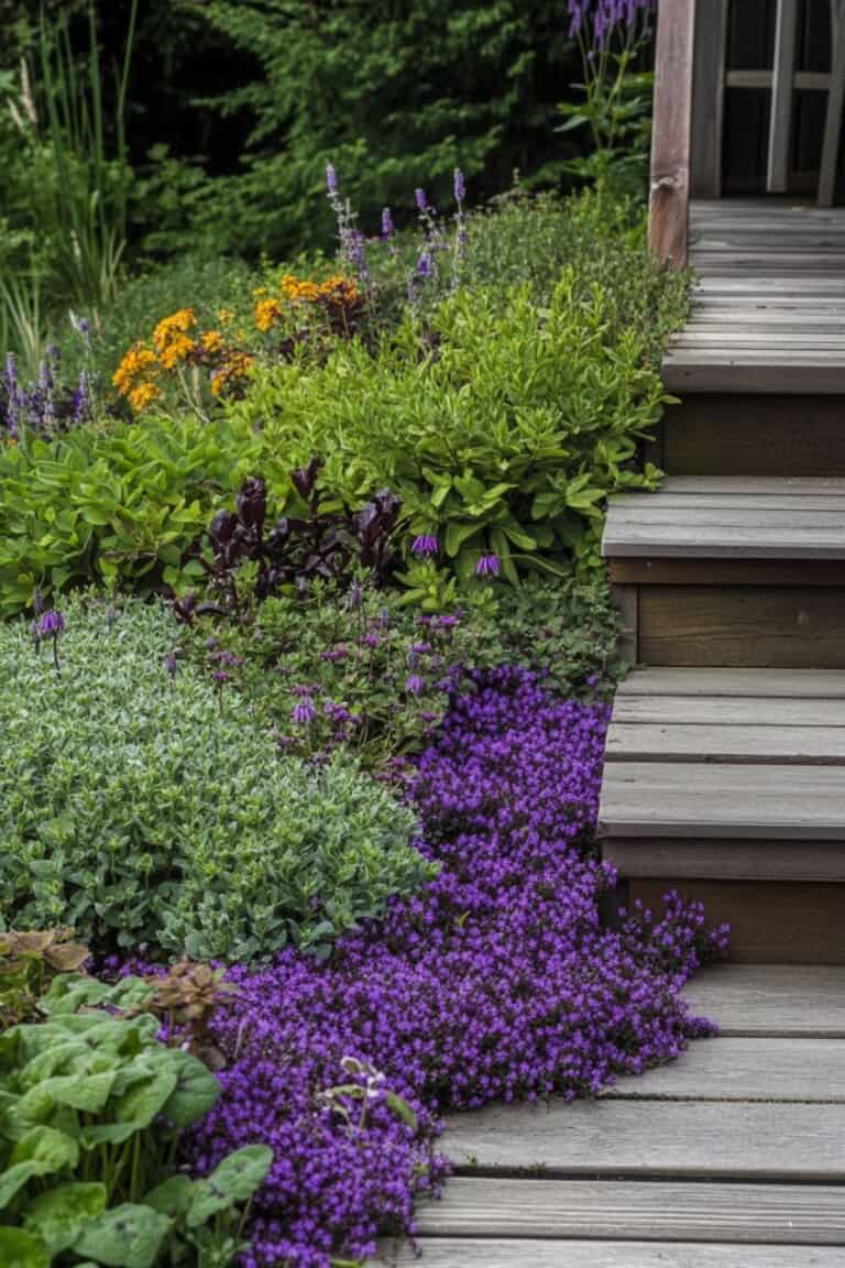 Ground cover plants like creeping thyme, vinca, ajuga, or pachysandra work well because they spread on their own, stay low, and don’t need constant mowing or babysitting.