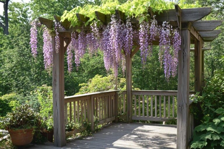 Adding climbing plants like clematis, climbing roses, or wisteria keeps it from feeling too structured or harsh.